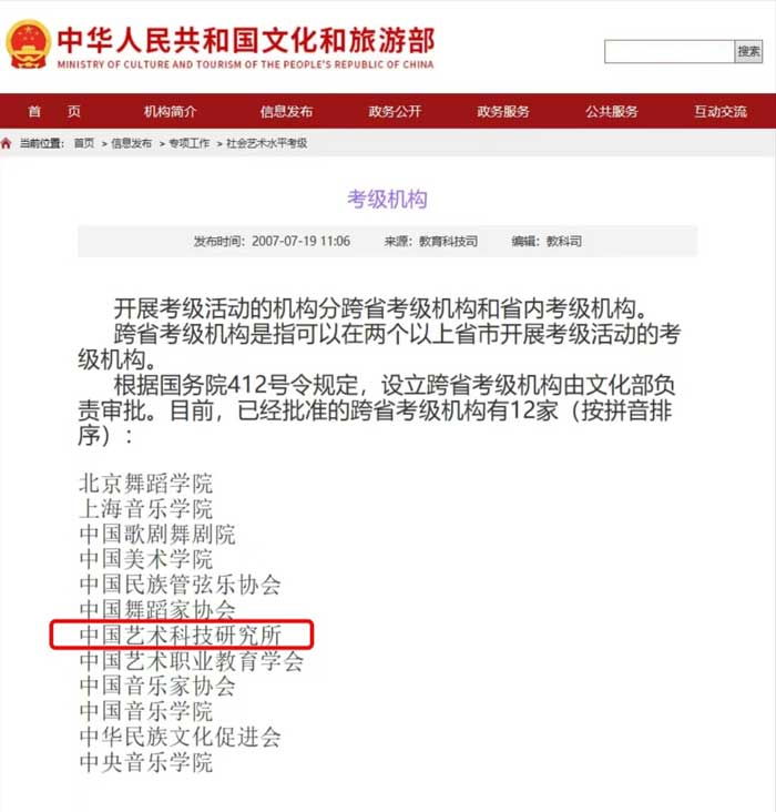 中华人民共和国文化和旅游部是国务院组成部委之一,是国家最高文化行政机关。文化和旅游部是“社会艺术水平考级”的审批、监督管理单位,中国艺术科技研究所是中华人民共和国文化和旅游部的直属事业单位,中国艺术科技研究所书法(软笔、硬笔)、美术(国画、西画)考级是具有政府资质、国家级的考级活动。中国艺术科技研究所也是中国书法、美术考级国标制定单位,代表着书法 、美术考级的国家标准。书法 、美术考级是社会艺术水平考级的一个重要组成部分,是检验教学质量和学习成果的一个重要途径,是普及社会艺术教育的一种重要手段。